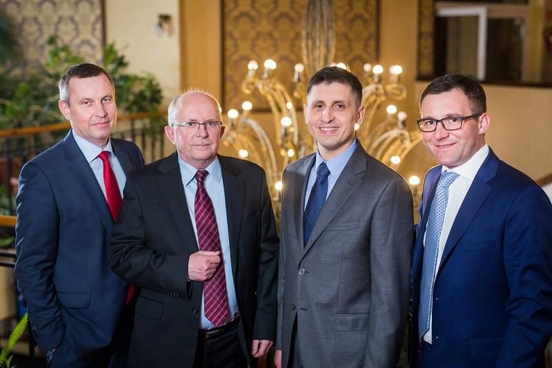 Na zdjęciu zarząd Unibep SA (od lewej): Leszek Gołąbiecki, prezes zarządu, Jan Piotrowski, członek zarządu, dyrektor handlowy, Sławomir Kiszycki, wiceprezes zarządu, dyrektor finansowy, Marcin Drobek, członek zarządu, dyrektor budownictwa.