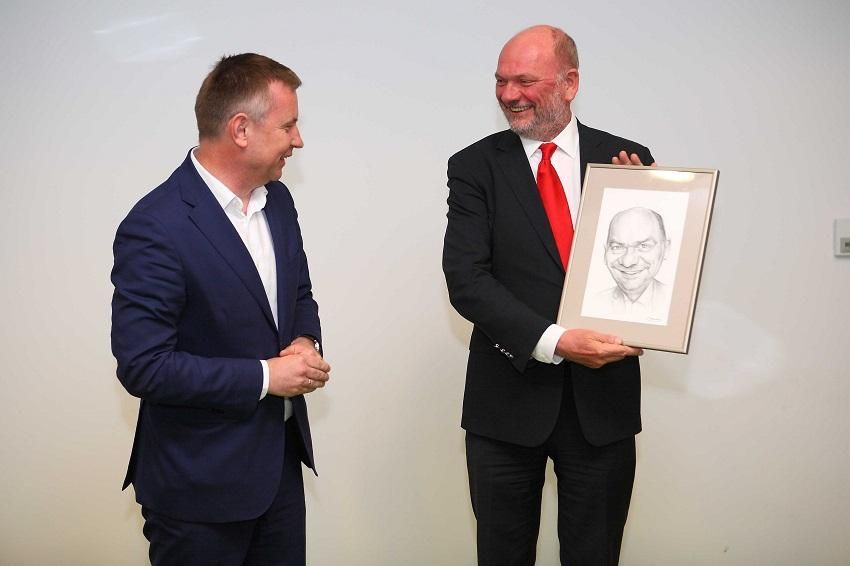 Na zdjęciu: W czasie spotkania Jerzy Werle, szef Warbudu (z prawej) dostał prezent – swoją karykaturę. Obok – Leszek Gołąbiecki, szef Unibep SA