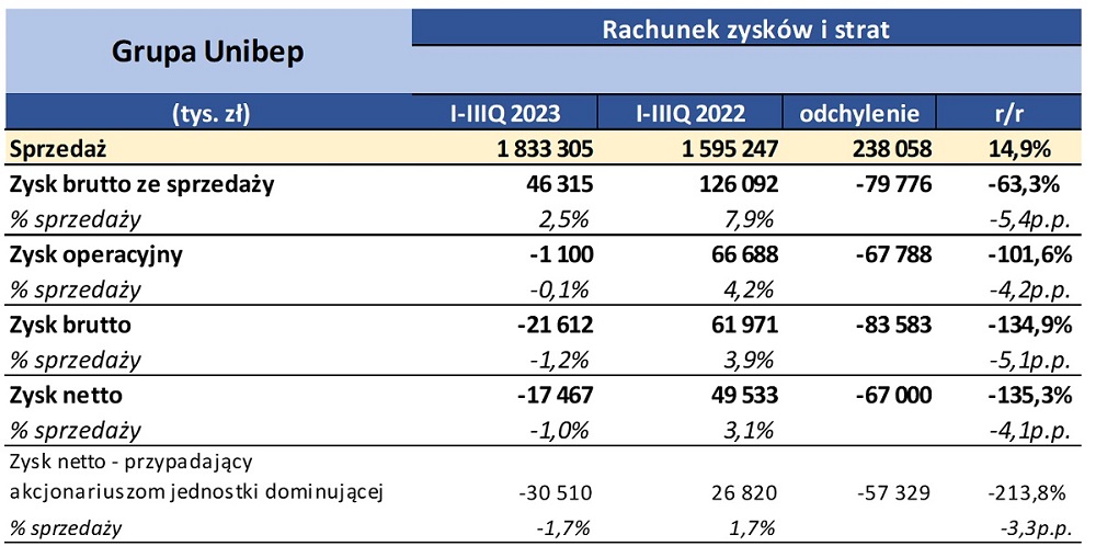 Zysk brutto Grupy Unibep ukształtował się na poziomie o ok. 84 mln zł niższym niż przed rokiem. Oprócz czynników wskazanych powyżej istotny wpływ na to miał wynik na działalności finansowej (pogorszenie o ok. 16,5 mln zł względem trzech kwartałów roku ubiegłego) - głównie za sprawą wyższych kosztów odsetkowych, ujemnych różnic kursowych oraz wyceny aktywów finansowych.