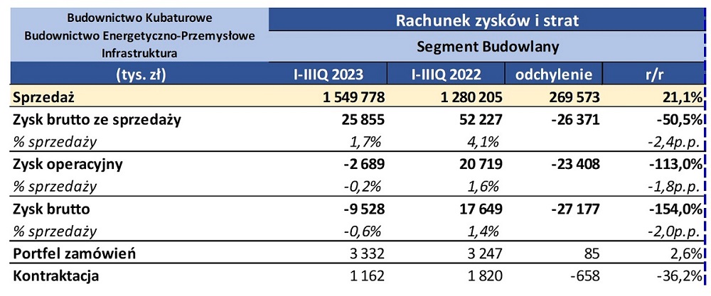 W Segmencie Budowlanym, obejmującym obszary budownictwa kubaturowego, infrastruktury i energetyczno-przemysłowy, po III kwartałach 2023 roku sprzedaż wyniosła ok. 1.550 mln zł (wzrost o 21% r/r). Największą dynamiką obrotów charakteryzował się obszar energetyczno-przemysłowy, gdzie wzrost wyniósł 234%. Tak dynamiczny rozwój tej części naszej działalności jest wynikiem efektu bazy. Biznes ten rozpoczął działalność w IQ 2022 roku, rozpoznając do końca IIIQ 2022 roku przychody z pięciu kontraktów. Aktualnie w ramach tego obszaru realizowanych jest ok. 20 kontraktów. W ramach tego segmentu spadek obrotów (o 36%) wystąpił jedynie w obszarze infrastruktury, co jest wynikiem tego, że wiele kontraktów jest realizowanych w formule „zaprojektuj i wybuduj” i aktualnie trwają prace projektowe.