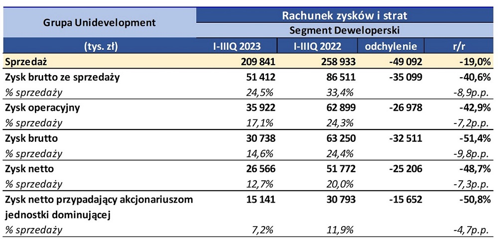 Grupa Unidevelopment wypracowała zysk operacyjny na poziomie 35,9 mln zł (w porównaniu z 62,9 mln zł za trzy kwartały 2022 roku). Jak wskazano na wstępie komentarza spadek rentowności tego segmentu spowodowany był sprzedażą znaczącej liczby lokali klientowi instytucjonalnemu, co zawsze związane jest z realizacją niższej marży. Mimo zmniejszenia rentowności tego segmentu, Zarząd w dalszym ciągu nie dostrzega negatywnych tendencji na rynku deweloperskim. Przeciwnie, w ocenie Zarządu popyt na nowe mieszkania w 2023 roku przewyższał poziom z roku 2022, na co istotny wpływ ma wejście w życie rządowego programu mieszkaniowego „Bezpieczny kredyt 2%”. Zgodnie z danymi BIK we wrześniu 2023 roku wartość udzielonych kredytów hipotecznych wyniosła blisko 7,2 mld zł, co oznacza wzrost o blisko 233-proc. r/r oraz o prawie 39 proc. m/m. Zwiększone zapotrzebowanie na nowe mieszkania zbiegło się w czasie z małą podażą lokali na rynku zarówno pierwotnym, jak i wtórnym, co w perspektywie najbliższych kwartałów pozwala z optymizmem patrzeć na sprzedaż oraz rentowność tej części naszej działalności.