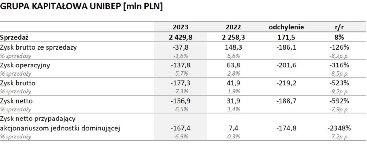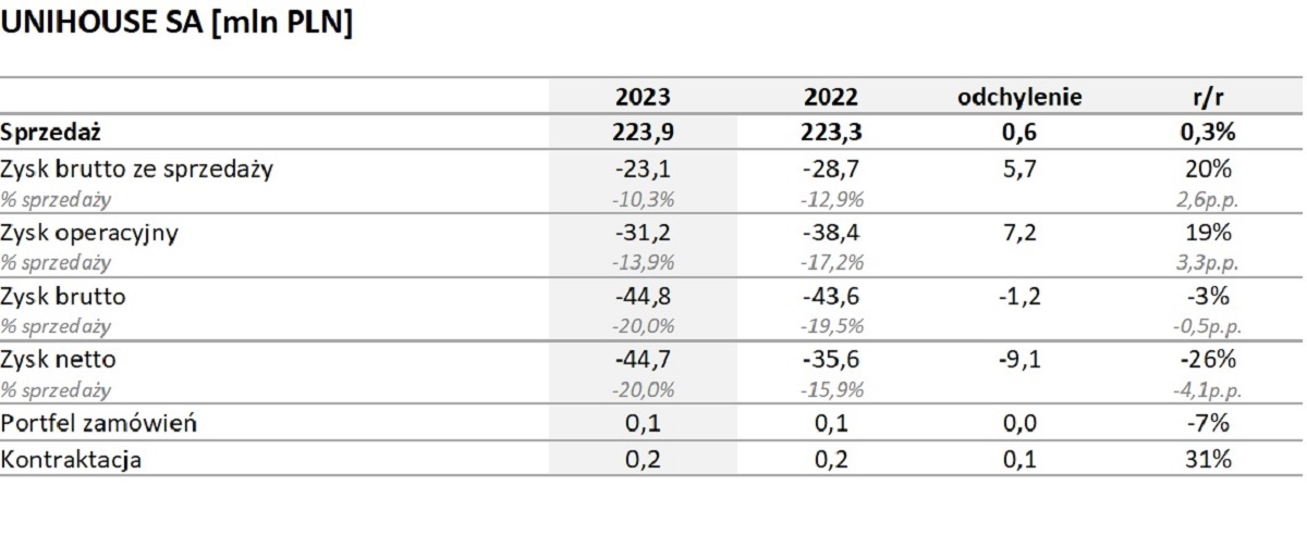 Wyniki Grupy Kapitałowej uwzględniają również koszty przestojów związanych z niewykorzystanymi mocami produkcyjnymi w fabryce domów modułowych Unihouse S. A. oraz niższe od założeń efekty wynikowe z kontraktacji projektów budowlanych pozyskanych w roku 2023.