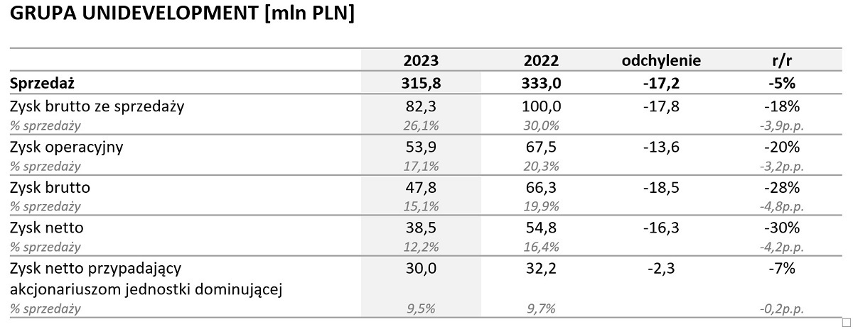 W wyniku procesu agregacji danych finansowych wstępne szacunkowe dane finansowe za cały 2023 roku wskazują, że Grupa Unidevelopment wypracowała zysk operacyjny na poziomie 53,9 mln zł (w porównaniu z 67,5 mln zł za analogiczny okres poprzedniego roku). Niewielki spadek rentowności tego segmentu spowodowany był sprzedażą znaczącej części lokali klientowi instytucjonalnemu, co zawsze związane jest z realizacją niższej marży niż w przypadku sprzedaży nabywcom indywidualnym.