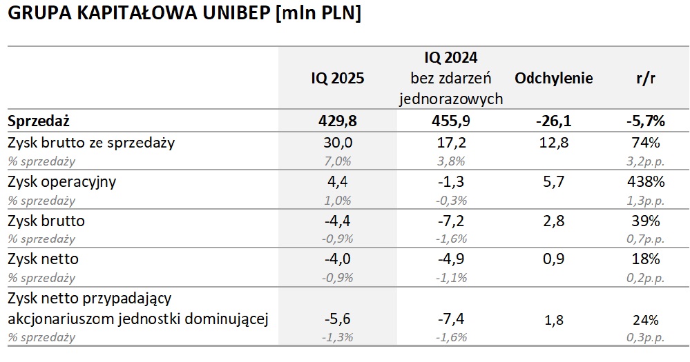 Emitent podkreśla, że analizując wyniki I kwartału 2025 roku na tle danych finansowych za analogiczny okres poprzedniego roku należy pamiętać o jednorazowej wymowie ww. zjawisk, zaś wyniki zeszłoroczne „oczyszczone” z efektu ww. zdarzeń wskazywały na osiągnięcie straty operacyjnej w wys. -1,3 mln zł, co ukazuje tabela poniżej. Tak więc rezultaty finansowe uzyskane przez Grupę Kapitałową Unibep za okres I kwartału 2025 roku są zdecydowanie lepsze niż w roku ubiegłym tak na poziomie operacyjnym, jak i na poziomie zysku netto.