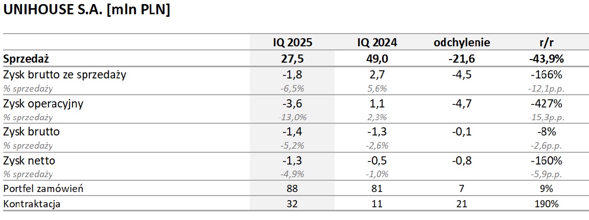 Za I kwartał 2025 roku segment modułowy realizowany i nadzorowany przez Unihouse S.A. uzyskał sprzedaż na poziomie ok. 28 mln zł, tj. ok 44% niższą niż w analogicznym okresie roku poprzedniego (spadek o 21,6 mln zł). Rentowność operacyjna została odnotowana na poziomie -3,6 mln zł i tym samym była niższa niż w analogicznym okresie roku poprzedniego.