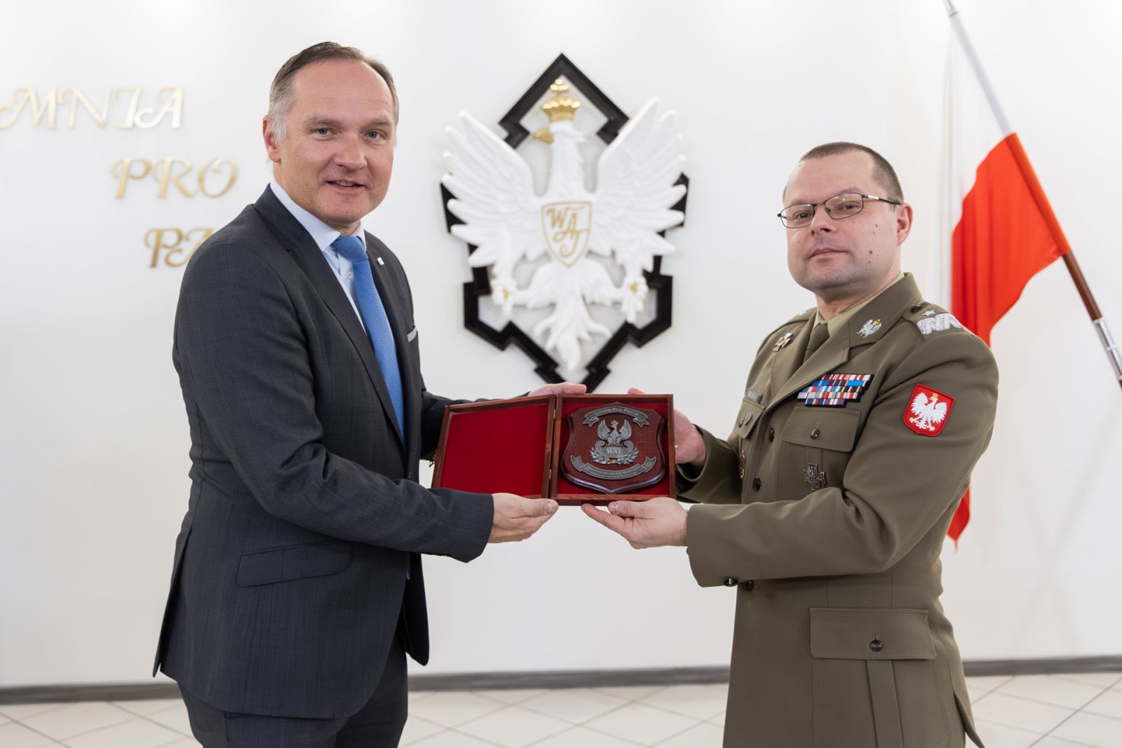 Uczelnię w spotkaniu reprezentowali także: Dziekan Wydziału Elektroniki płk dr hab. inż. Jan Kelner, prof. WAT, Prodziekan ds. studenckich Wydziału Inżynierii Mechanicznej ppłk dr inż. Krzysztof Gocman, Prodziekan ds. studenckich Wydziału Cybernetyki dr Joanna Piasecka, prof. WAT i Aleksandra Benedykciuk z Biura Karier.