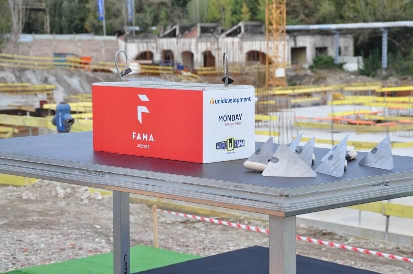 The housing estate Osiedle Fama Jeżyce is a project implemented by Fama Development, whose investors are Unidevelopment SA and Wiepofama SA. Implementation of the investment, project supervision, sales and marketing services, and project management, they all have been entrusted to Monday Development - a company which belongs to the Unidevelopment group. The laying of the foundation stone for one of the largest development investments in Poznań was accompanied by the official signing of the foundation act. Their signatures put: Deputy Mayor of the City of Poznań, President of the Supervisory Board of Unibep SA, President of the Management Board of Unibep SA, President of the Management Board of Unidevelopment SA, Main Shareholder of Wiepofama SA, President of the Management Board of Wiepofama SA and Co-founder of the architectural office HRA Architekci. The document was enclosed in a capsule and symbolically laid into the ceiling of the first building.