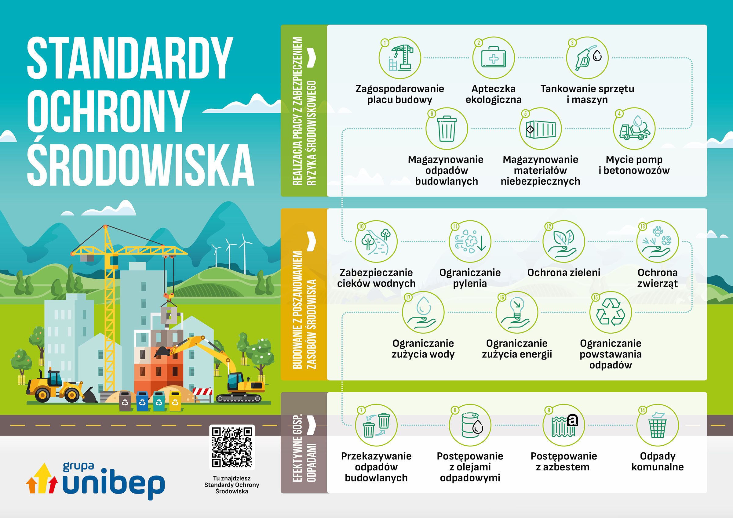 Z przyjemnością informujemy, że Grupa Unibep wdrożyła zestaw standardów ochrony środowiska, którymi będziemy kierować się podczas realizacji procesów budowlanych. Standardy ochrony środowiska stanowią ujednolicone i zawarte w przystępnej formule opisy sposobów postępowania, które mają na celu ograniczanie wpływu naszej działalności na zasoby wodne, glebę, powietrze, bioróżnorodność oraz klimat.